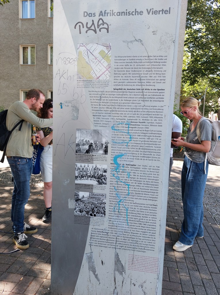 From the Mohrenstraße in the center of Berlin to the Afrikanische Straße, the Swakopmunder Straße, the Ghanastraße and the Togostraße, through to the Windhuker Straße, Dauerkolonie Togo, and Dauerkolonie Klein Afrika all in Das Afrikanische Viertel (African Quarters) of Berlin, the traces of German colonial history and heritage is visible to see in the street names. This was an insightful and enriching research visit in which I saw the over 10 years of struggle for street name change to the Manga-Bell Platz and the importance of such name changes to the decolonial process. As the tour guide stressed repeatedly, with these changes to the names of the Heroes of the decolonial and resistance struggles we get to tell the same history but this time from the perspective of and fronting the heroes. I got to learn about the mundane process of guiding this tour, hearing the narrative of the tour guide and the interaction with the visitors on the tour. I was able to engage the participants in a focus group discussion at the end of each tour learning about their motivations for joining the tour, their experience during the tour, the insights gained, the value of the tour relative to among others, the cost per person and how the plan to make use of the new knowledge and insights once the tour ends.