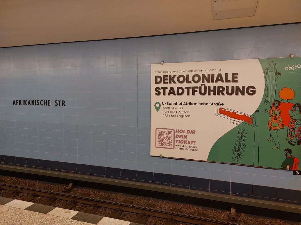 As part of a wave of ongoing decolonisation process across many European countries and their major cities, the Dekoloniale Stadtführung (Decolonial Tour) Berlin emerged about 2 years ago. With the motto “Walk the past, Change the future”, this Historical Tour of the African Quarters in Berlin’s Wedding (Mitte) area, aims to give insight into the often forgotten German colonial history. It is a 2-hour walking tour that takes place on Saturdays and Sundays with German tours at 11.00 and English tours at 14.00. For my scoping research, I signed up for the English tour on Saturday and the German + English tour on Sunday. In the end, I went on only the 2 English tours available this weekend as the German tour on Sunday morning was cancelled.