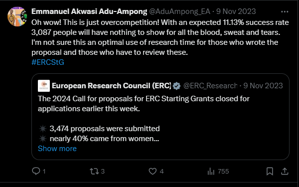 The funny, maybe not so funny now, thing is my tweet from last year. This was 2 days after I submittted my application and the ERC announced the total number of 3,474 applications chasing after an expected 387 grants. Thankfully the amount of funding available was increased as you can see in the second image below.